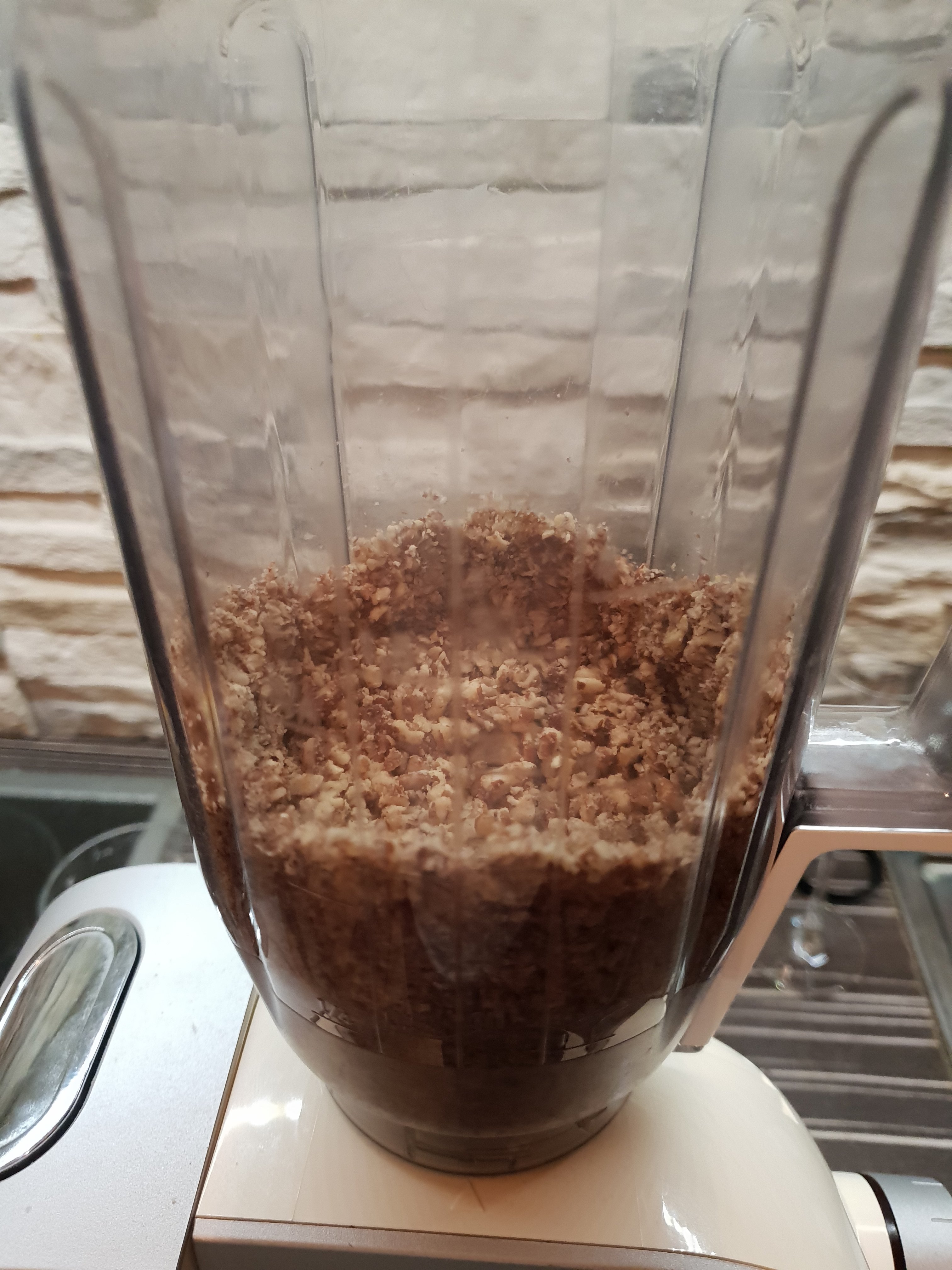 Pon las nueces en la batidora y muelelas. Pueden quedar finas o con pedacitos más grandes. Depende de cómo quieras la galleta.