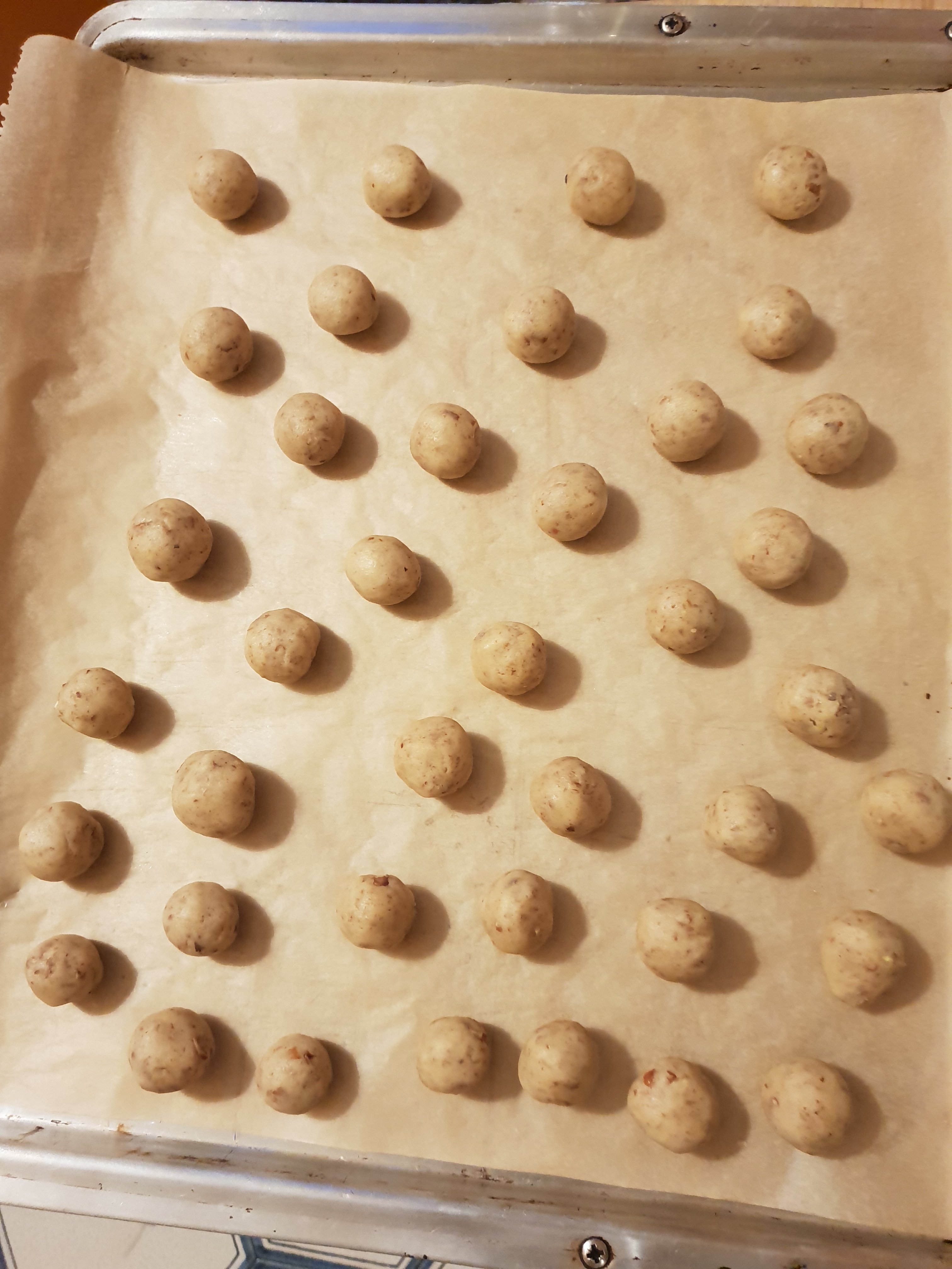 Saca la masa del refrigerador y vuélvela a amasar, al principio se va a quebrar pero siguela juntando y amasando. Cuando se mantenga junta, puedes comenzar a formar bolitas de 2 a 3 centímetros. Y las colocas en la bandeja con papel encerado, dejando espacio entre ellas para que no se peguen.